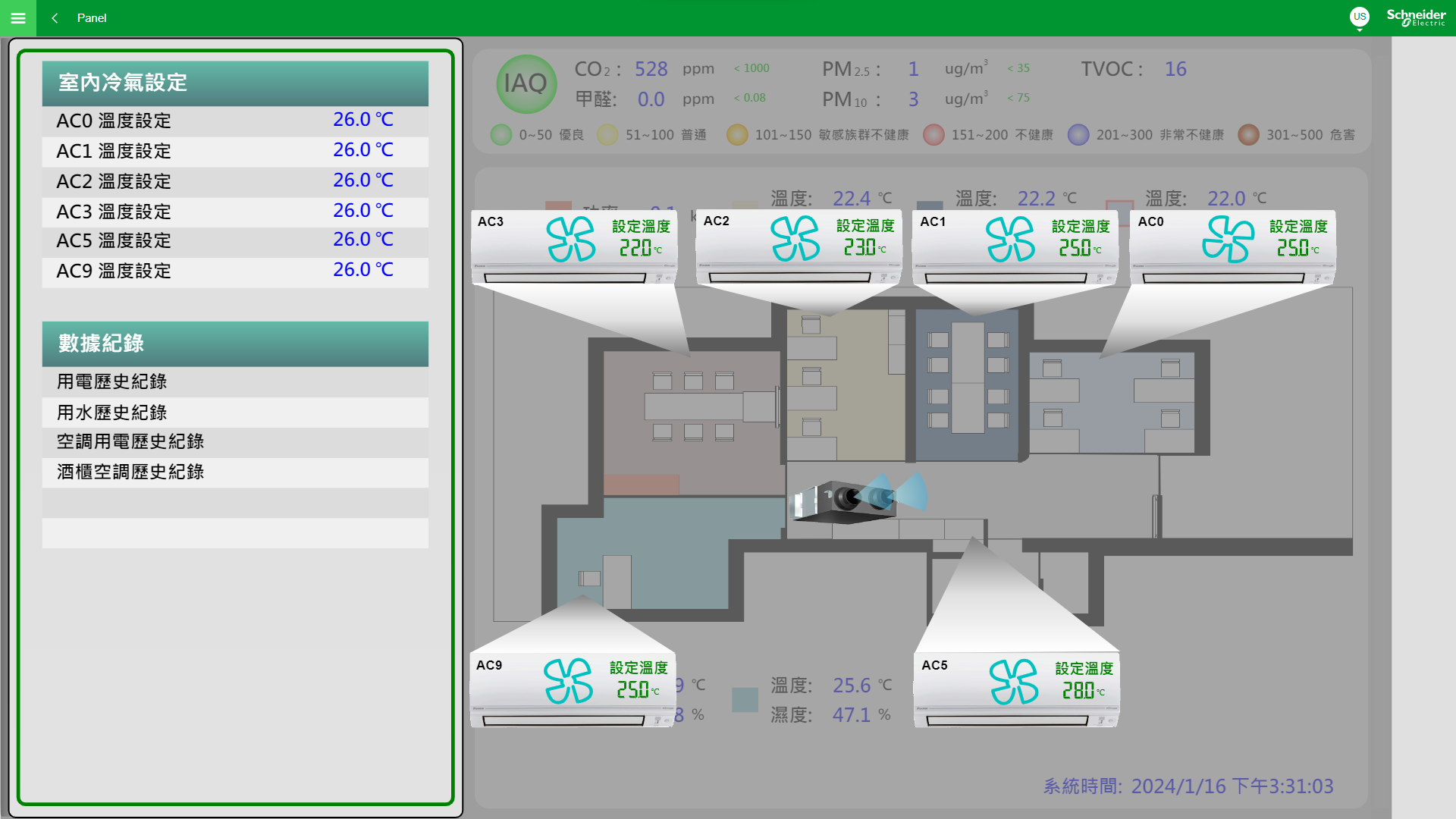Moreover, the panel can switch to an equipment operation screen to monitor the operational status and is coupled with surveillance cameras for real-time monitoring of the office’s conditions. With the proprietary development of this monitoring system, Green Value aims to create a more environmentally friendly and energy-efficient office environment, while also enhancing the comfort and safety of the workplace for employees.