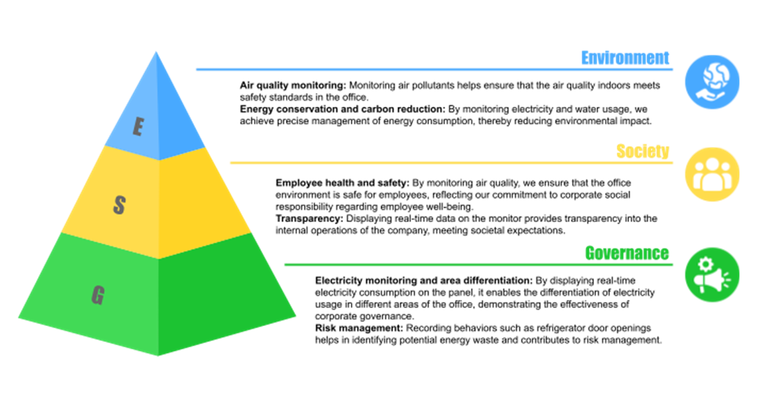 These systems ensure that office colleagues can feel confident about their daily working environment, establishing a space that is both healthy and energy-efficient. This not only helps to improve work efficiency and employee quality of life but also fulfills Green Value’s commitment to environmental protection and sustainable development. Through continuous monitoring and improvement of the office environment, we practice green energy management, creating a more sustainable future for the company and aligning with the three key components of ESG: Environmental, Social, and Governance.
